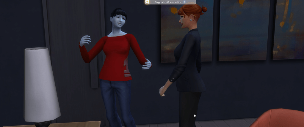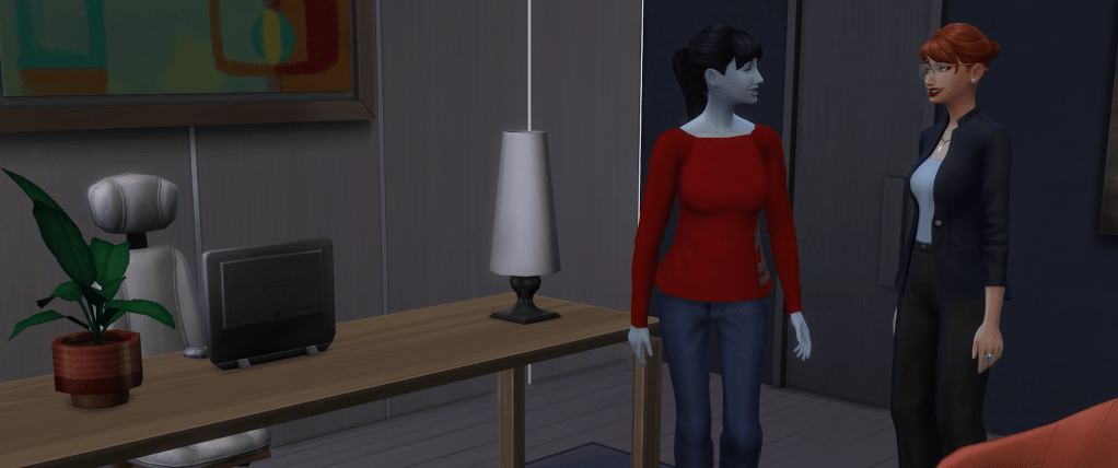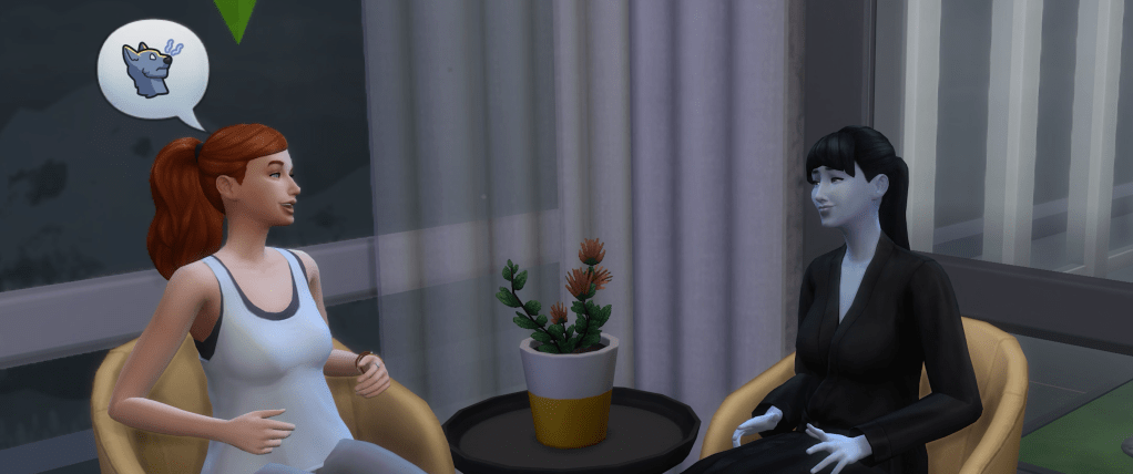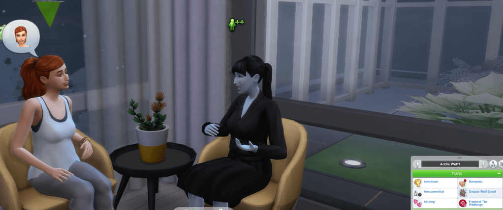 But then I thought let’s go further with Addie’s character and really push it. With the new update for the Sims4, polyamory is now a feature in the game. So, I thought why not make Addie a polyamorous werewolf with killer business instincts. Plus, Addie is afraid of getting close to someone. The safety net of her friends gives her the best of both worlds without having to do much dating. But when she meets Nina, everything changes – she wants to be with her, but can Nina accept that other part of her? This is where the twist of the dynamic comes into play and makes for some interesting gameplay too.
