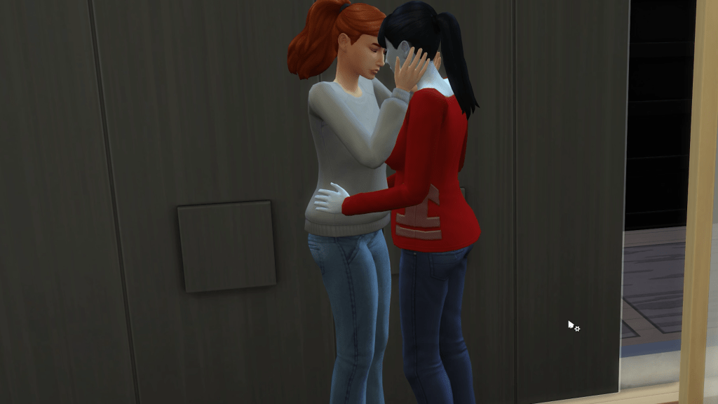 I also thought due to Addie’s strength and stamina as a werewolf, she’s pretty strong and easily lift Maryn off the ground. It resulted in a funny jealousy scene when Nina sees this. The mod I used was MapleBell’s More Kisses mod. I laughed when I saw the daily of this.