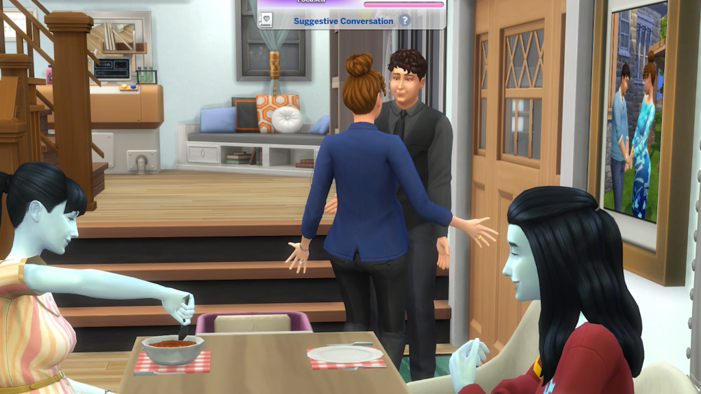 When Tony comes home, he is in a bad mood from having a hard day. He sees everyone at the table enjoying dinner. Amanda jumps up and hugs him and asks about his day. He tells her, “Terrible! The bar was full of idiots! How was yours? Any better?”