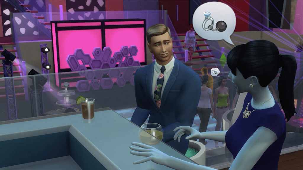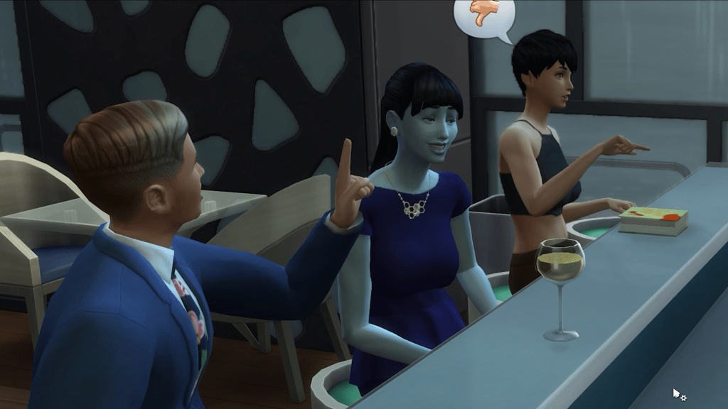 Meanwhile, a complicated unscripted fight is taking place in the background. It is between a young woman with short black hair and a bartender. These moments are rare. They usually turn out to be the funniest parts of the episode. Sims walking around in wedding dresses is another highlight.
